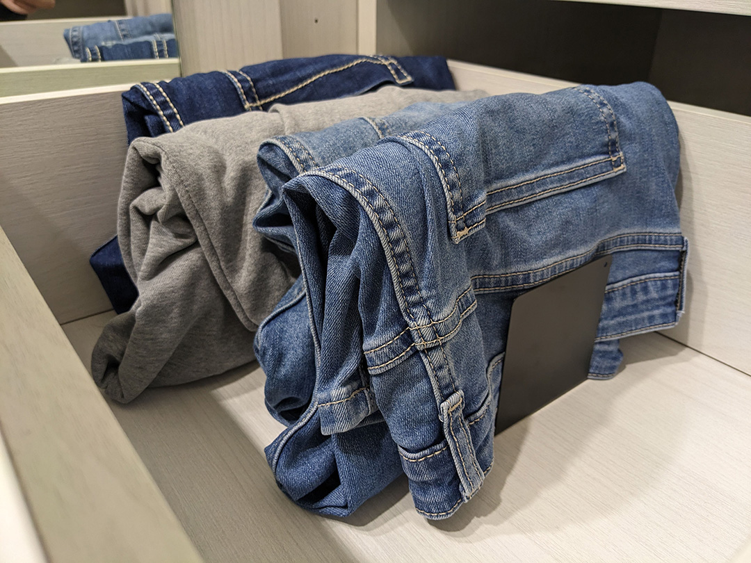 這裡可以再提供一個小技巧,衣服畢竟是軟的,如果想要直立著放疊好的衣服,通常會需要在抽屜內排滿,衣服們才能乖乖站著,但只要利用書擋就能創造出小隔間,即使是少少的衣服,也能乖乖站好。