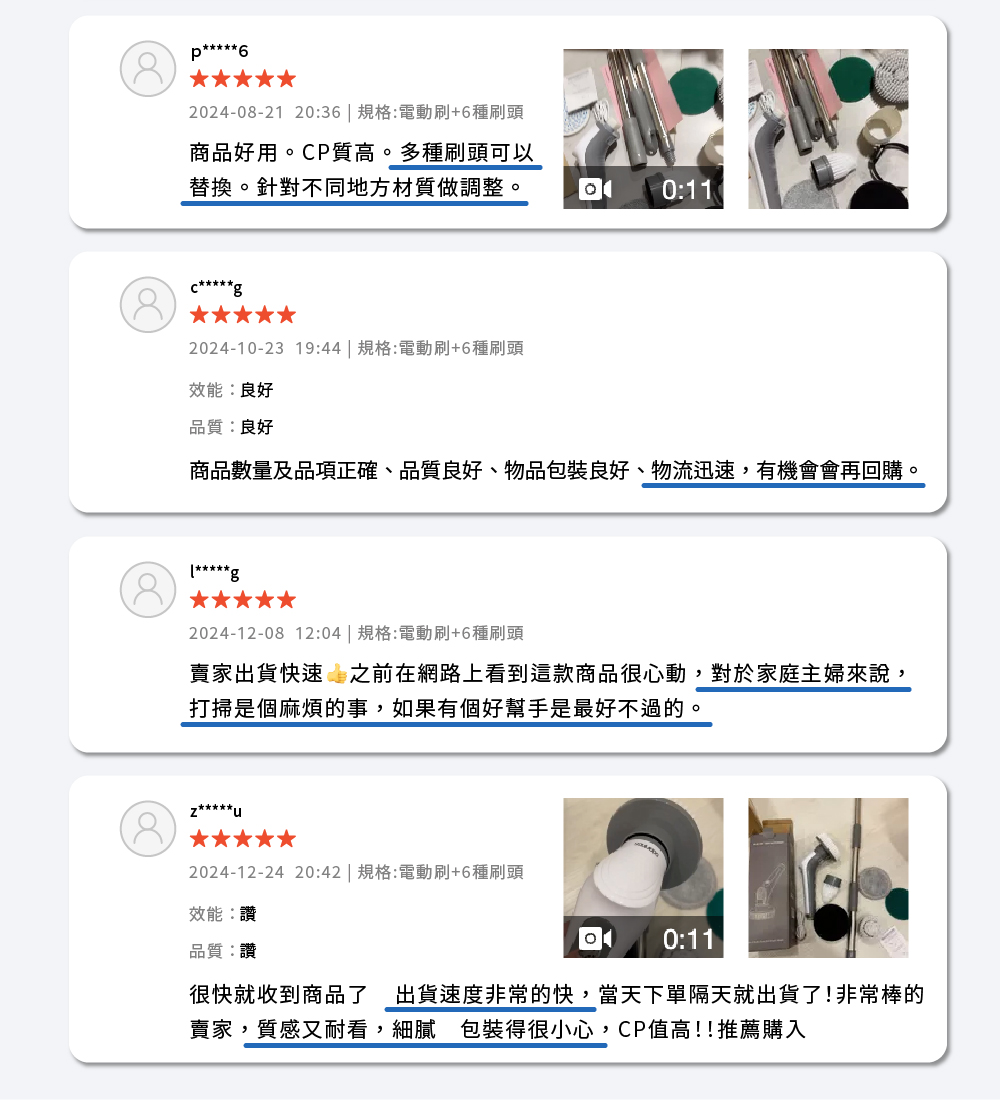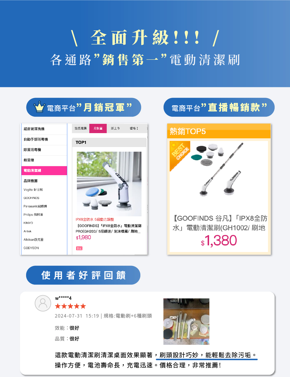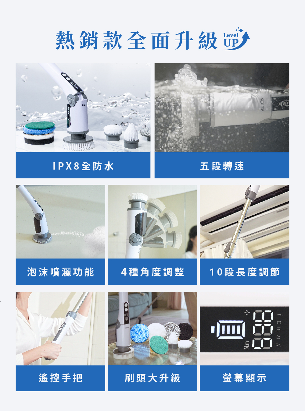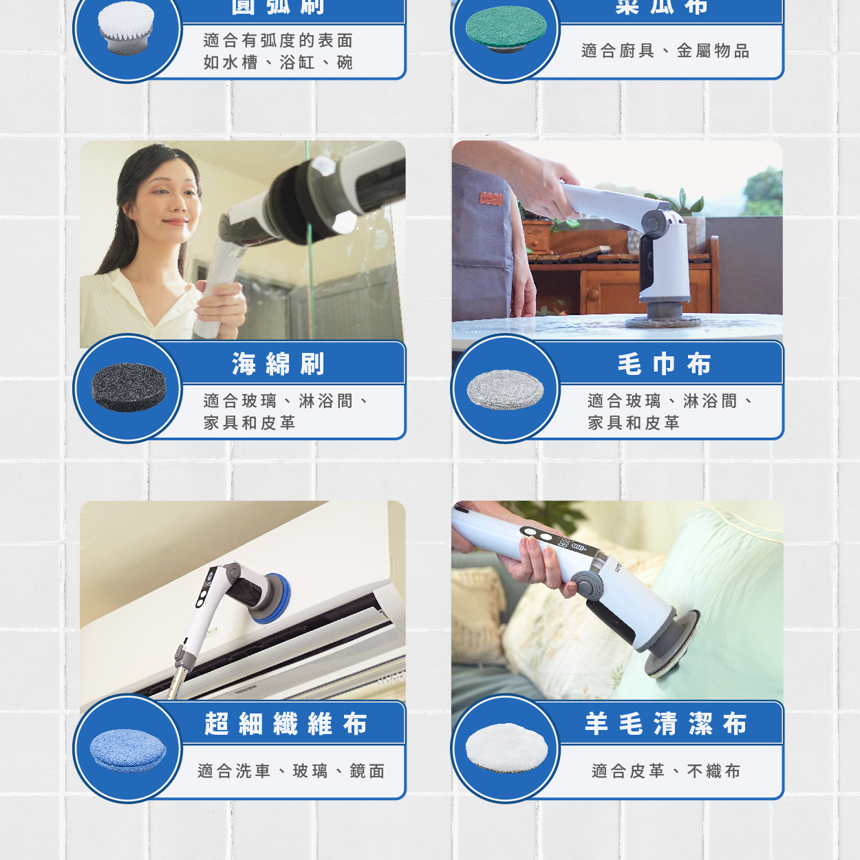 A: 贈送超多8種刷頭,除了地板之外,浴缸、洗手台、水槽、瓦斯爐甚至窗戶都可以清潔。只有想不到,沒有做不到,真正達到一機掃全家的概念