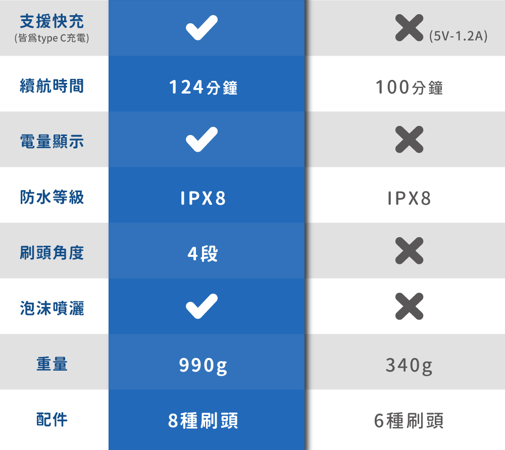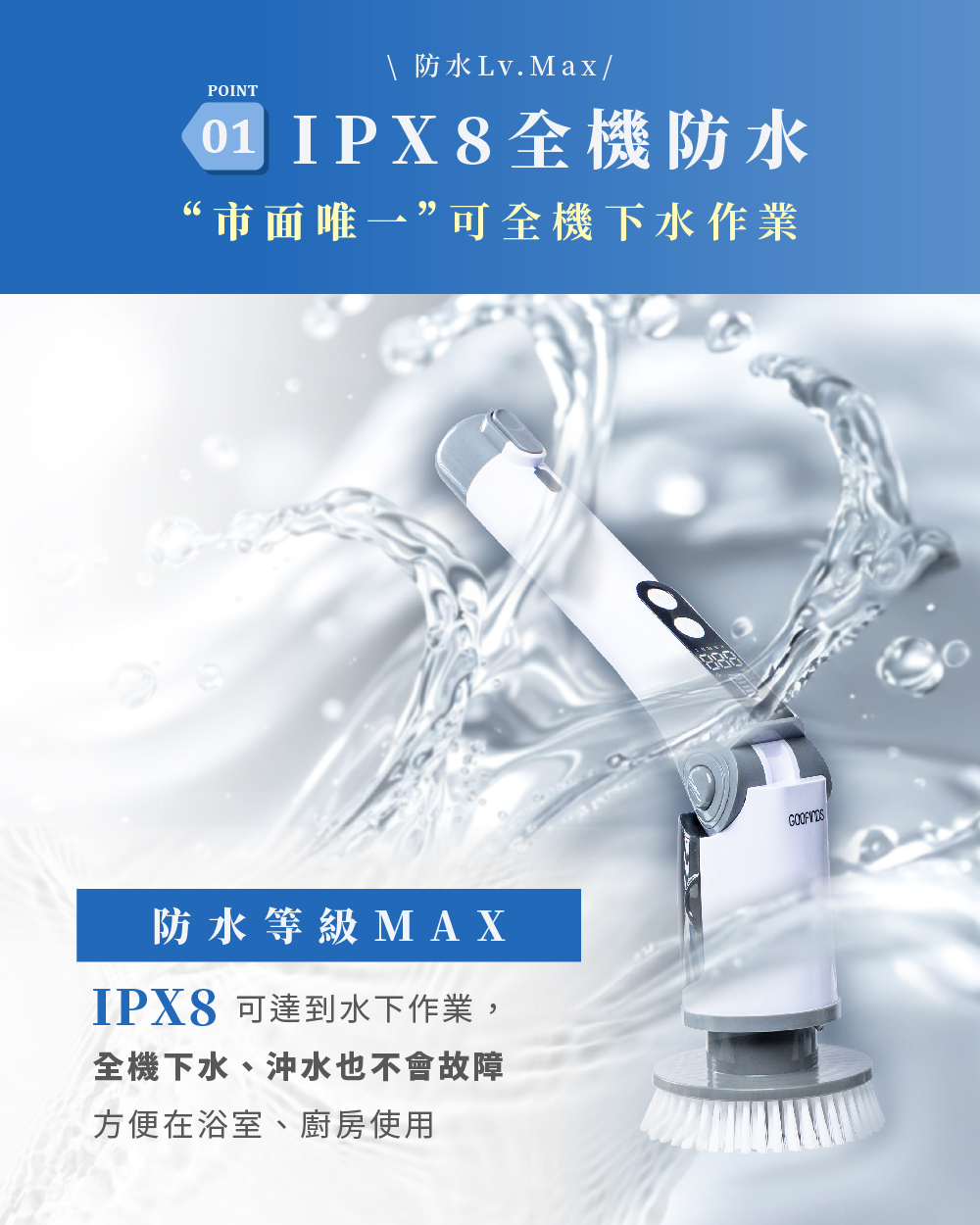 A: 全機IPX8級全防水,業界唯一可水下作業。唯一需注意將充電孔蓋緊以防止電機進水短路。