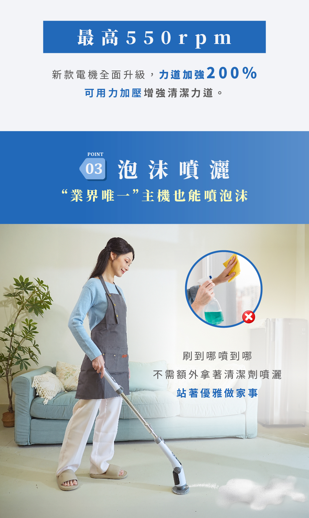 A: 使用者一樣可以用力去加壓。搭配550/分的高轉速,使用電動旋轉再次加壓的方式,除了更乾淨之外也讓打掃更輕鬆。