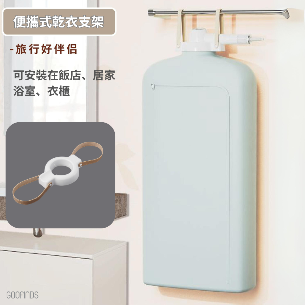 A::支架有附贈掛鉤,可懸掛衣架。免釘膠最大承重5kg,掛多件衣物也沒問題。