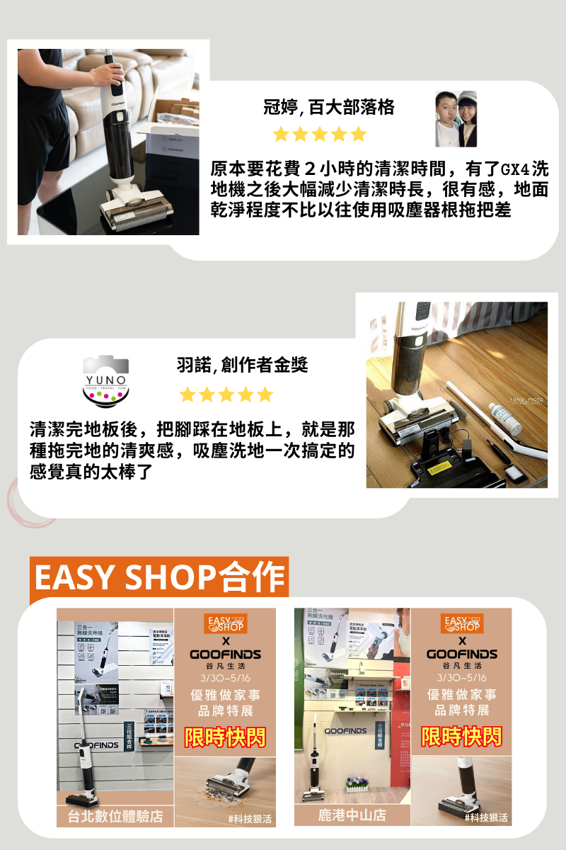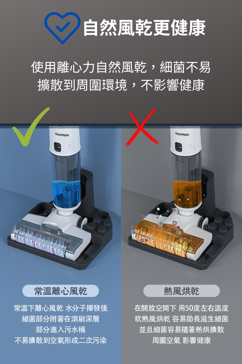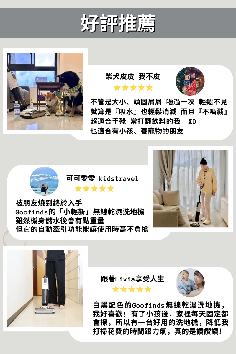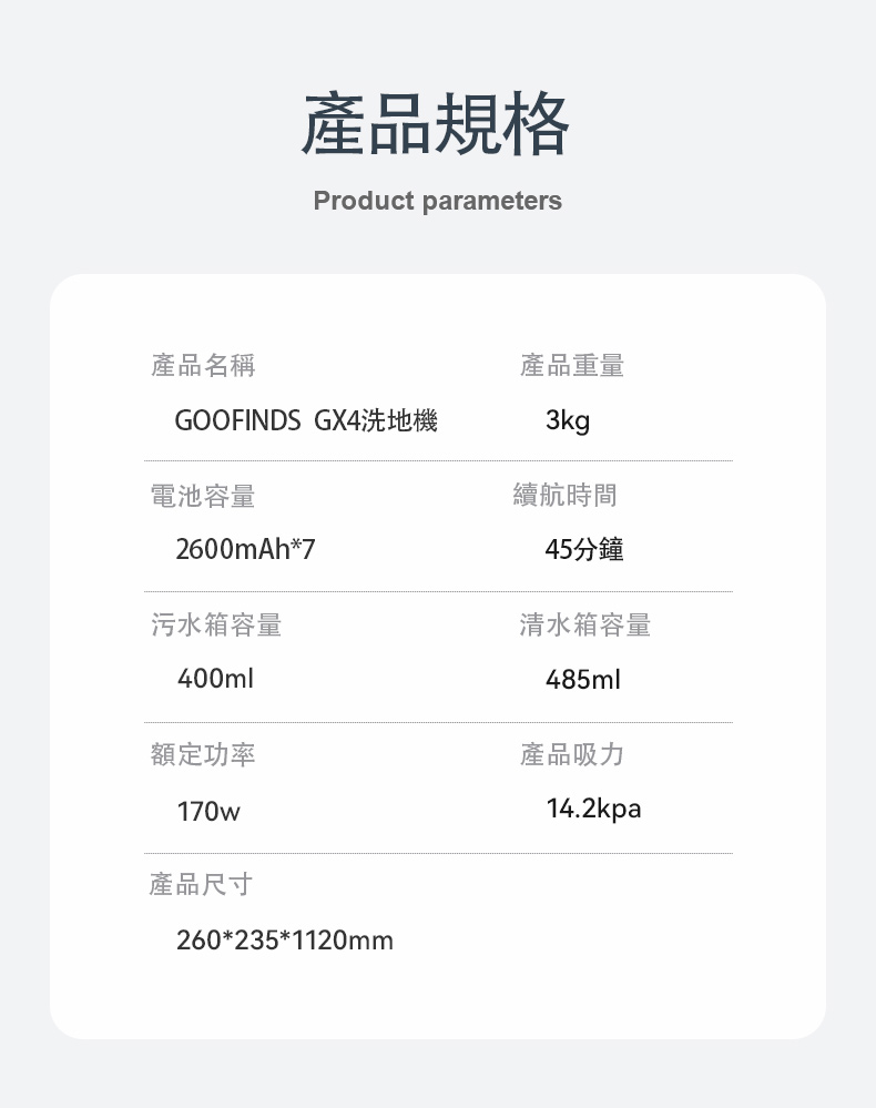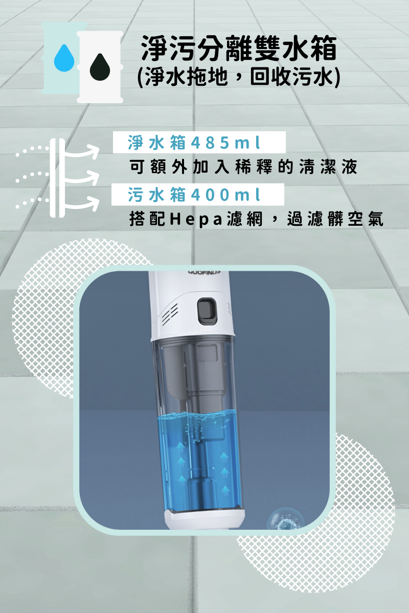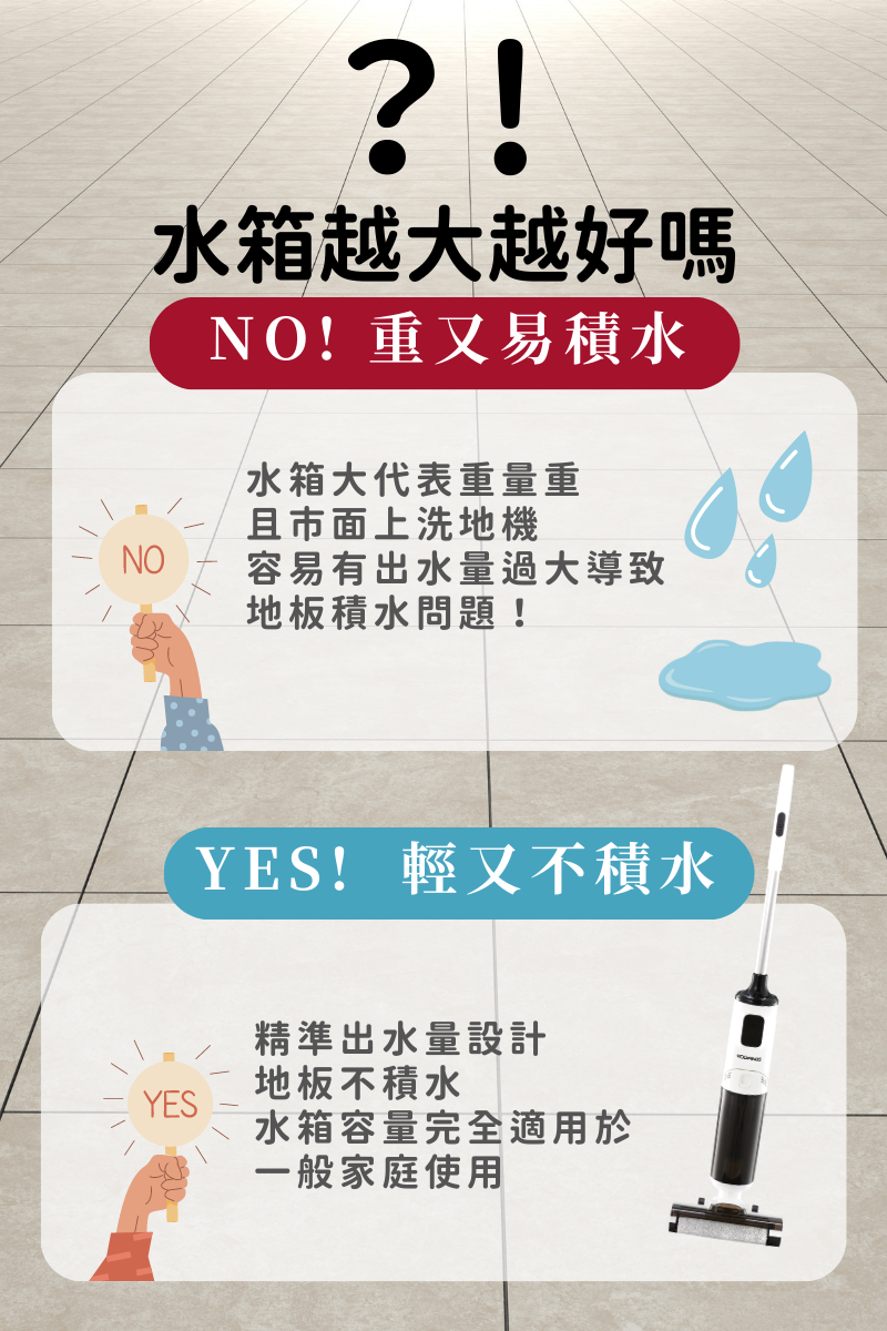 A:水箱過大即代表重量越重和出水設計不精準,我們的產品有針對出水量做優化,不像市面上洗地機出水量過大容易讓地板積水,我們的容量也完全可以針對一般家庭的清潔來做使用。