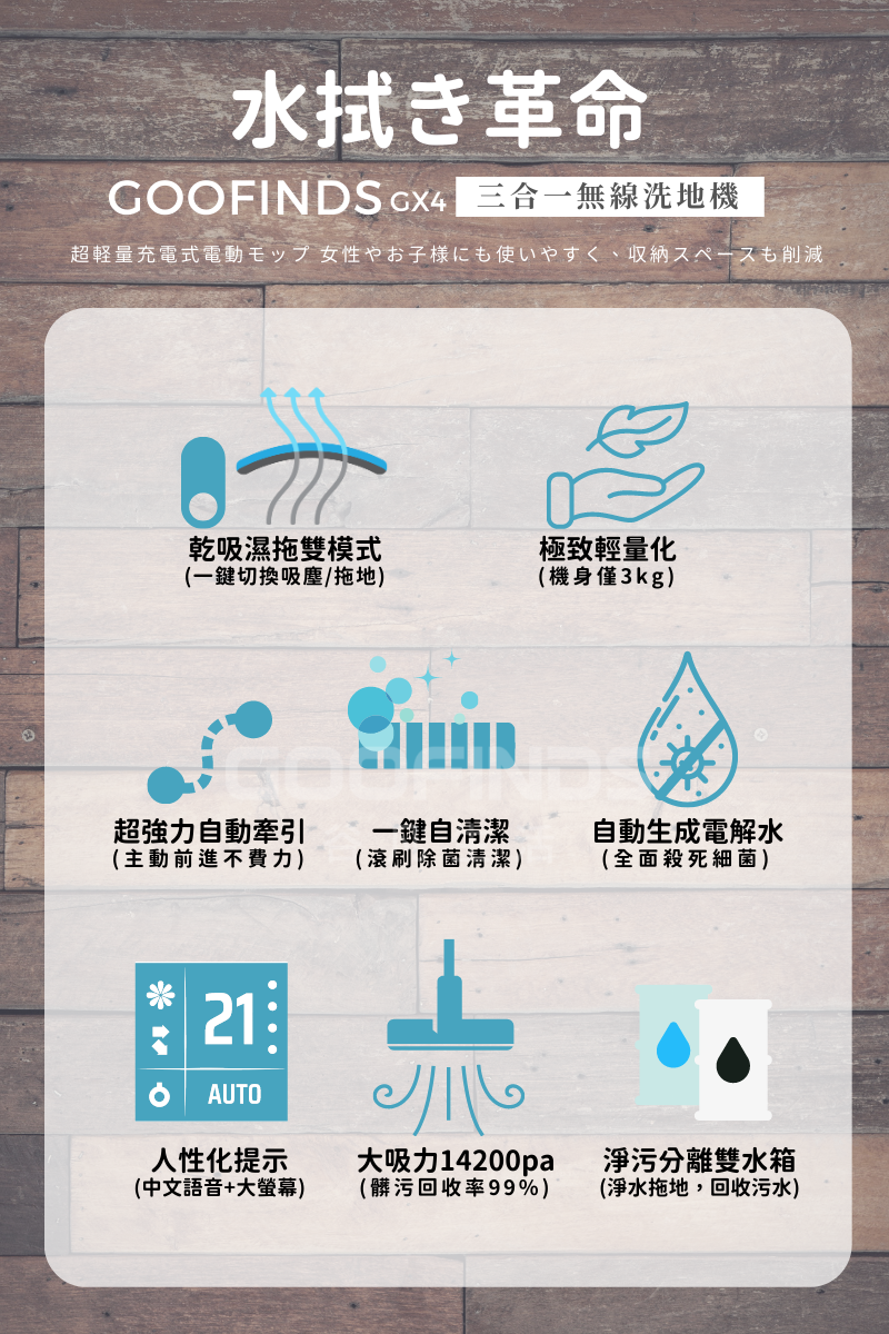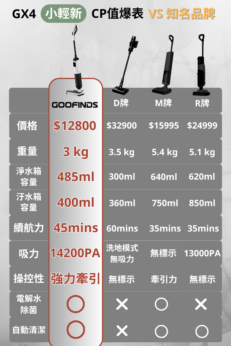 A:我們有著市面上最輕巧的3kg重量,加上強力自動牽引,使用上非常輕鬆,就像洗地機帶著你走,完全不需出力